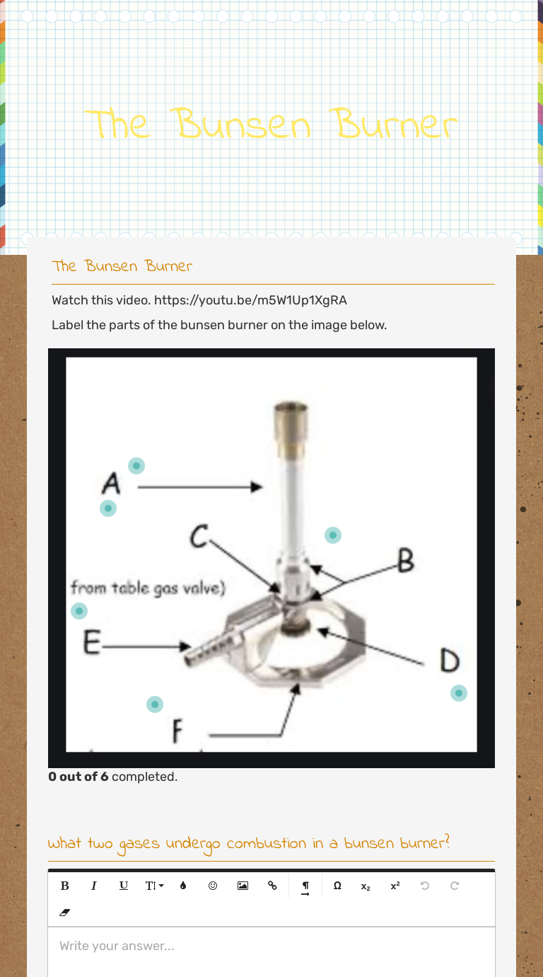 eChalk: The parts of a Bunsen burner Learn the different parts of a Bunsen burner with this interactive labelling exercise. (worksheet)...learning for the fun of it! This resource works with HTML5 or Flash. This activity will run on any browser that supports Flash or a modern browser with HTML5 support. This includes mobile devices such as iPads, Kindle and Android tablets as well ... Bunsen Burner Parts Learn these parts before you start. Draw a labeled picture of a Bunsen burner. desk stopcock mouth of barrel needle valve flint striker barrel burner nipple air intake holes Personal Safety Gear Take proper personal safety precautions: Bunsen Burner Basics - Flinn Sci The modern Bunsen burner has changed very little from Robert Bunsen's original design. It consists of a base, a gas inlet, the gas jet, the air control vent with a collar for adjusting the air flow, the barrel, and the mouth of the tube (Figure 1). Procedure for Lighting a Bunsen Burner 1. Clear off the lab bench. Labelling a Bunsen Burner - Labelled diagram - Wordwall Collar, Base, Gas Valve, Chimney, Flame (Inner Cone), Rubber Tubing, Flame (Outer Cone), Air Hole, Heat Proof Surface. Labelling a Bunsen Burner Share by Shonprebble KS3 Y7 Science Working scientifically Like Edit Content More Leaderboard Theme Switch template Interactives