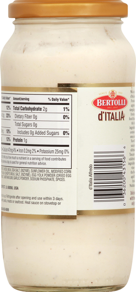 Bertolli d'Italia Four Cheese Alfredo Sauce, 16.9 oz - Kroger Nutrition Facts 8.0 servings per container Serving size 1/4 cup (60g) Amount per serving Calories 110 % Daily value* Total Fat 10g 13% Saturated Fat 5g 25% Trans Fat 0g 0% Cholesterol 30mg 10% Sodium 360mg 16% Total Carbohydrate 2g 1% Dietary Fiber 1g 2% Sugar 0g 0% Protein 2g 0% Calcium 79mg 6% Iron 0.2mg 2% Potassium 23mg 0% Vitamin D 0mcg 0%