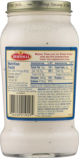 Bertolli Alfredo Sauce, 3 ct./15 oz. - Walmart.com Bertolli d'Italia Alfredo Sauce, Authentic Tuscan Style Pasta Sauce Made in Italy with Fresh Cream and Aged Italian Cheeses, 16.9 OZ. Add. $4.54. ... Nutrition facts. Refer to the product label for full dietary information, which may be available as an alternative product image. 7 Servings Per Container.